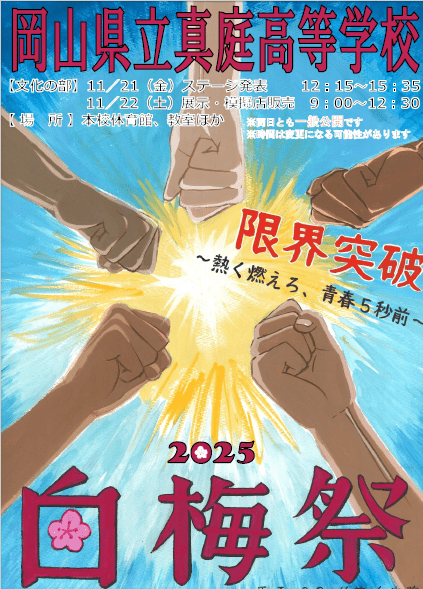 真庭高校の白梅祭 文化の部が開催されます。日程は 11月21日(金)ステージ発表12:15~15:35 11月22日(土)展示・模擬店 9:00~12:30です。両日とも一般公開ですので、多数の方々の来校をお待ちしております。