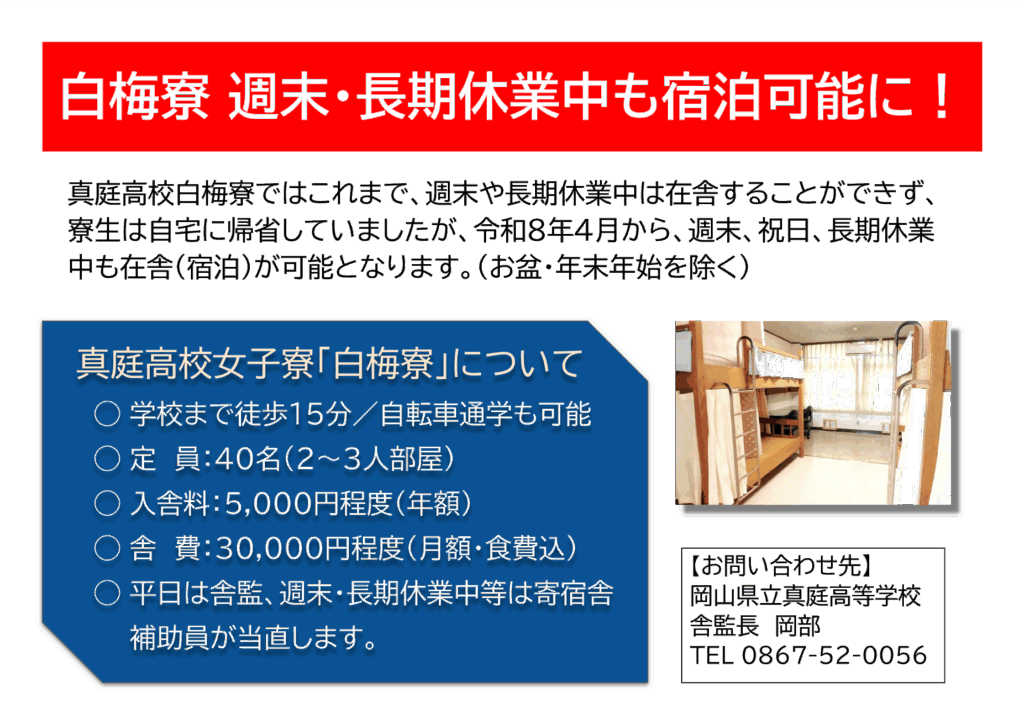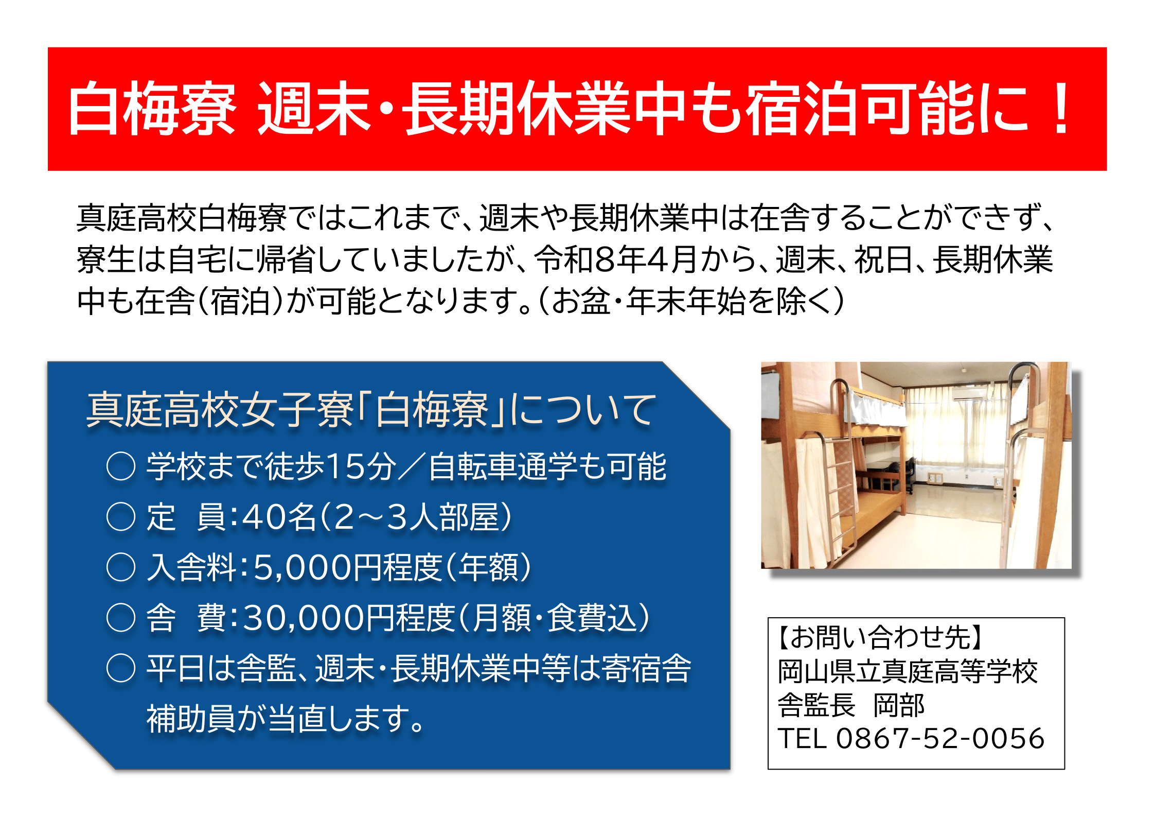 4. 白梅寮 週末・長期休業中も宿泊可能に!