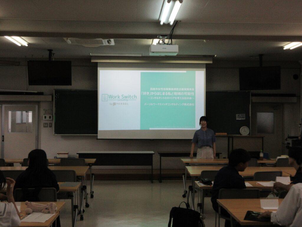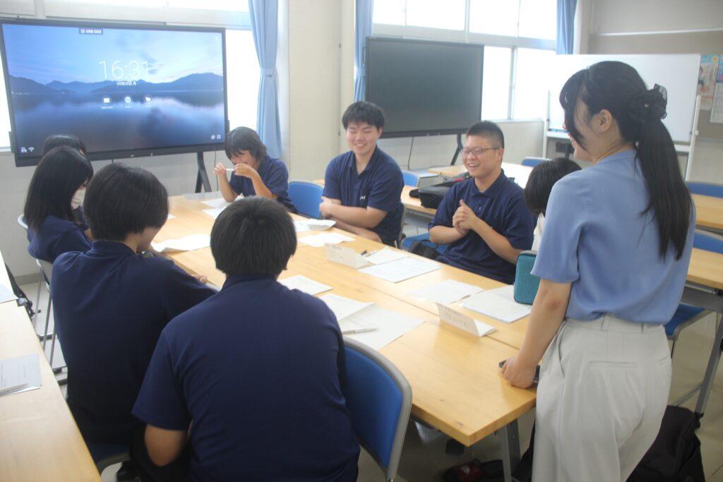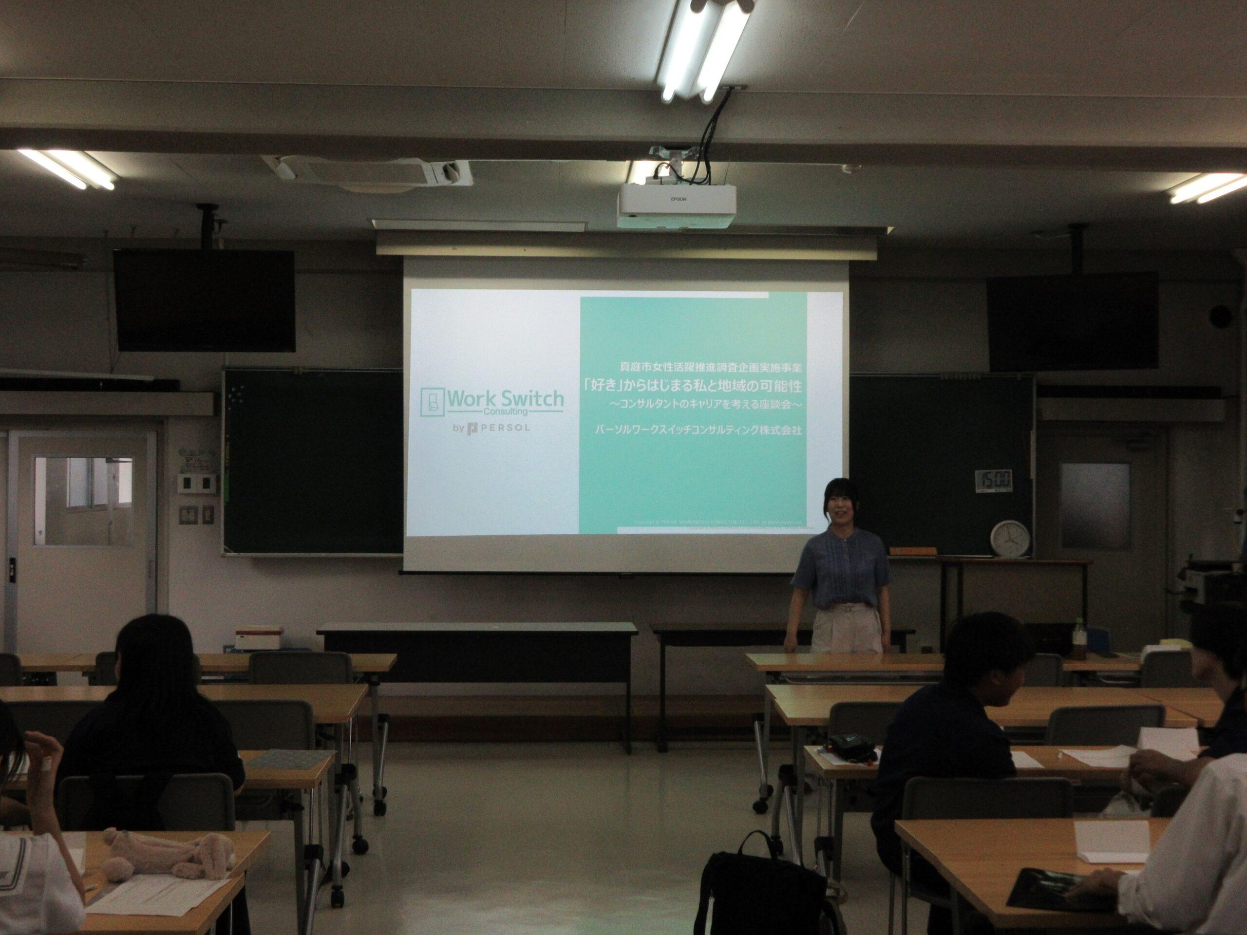 9月8日(月)16:00より本校大講義室にて、食農生産科及び経営ビジネス科1・2年生、計13名が参加し、パーソルワークスイッチコンサルティング株式会社から齊藤あかね様、葛西美結様をお招きし、将来の職業選択やはたらき方について、多様な視点から考えるきっかけをつかむ、および自分の関心や強みを発見し、それを活かすために情報収集や学びを主体的に行う重要性に気づくことを目的とした座談会が行なわれました。自分の『好き』を分解し、グループで考えを共有しながら、その『好き』が真庭市で『やりたいこと』や『好き』を実現するためにどのようなスキルやサポート、学びが必要かを考えてみました。生徒の中から『気軽に相談できる大人や先輩がいる場所』を作ってほしいという考えが出て皆で共有しました。