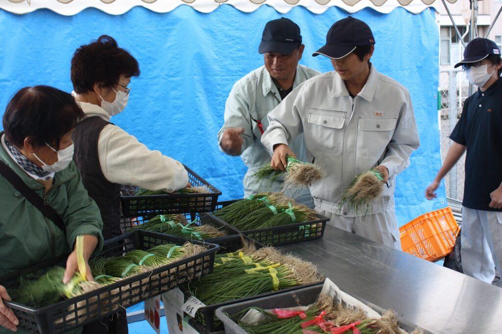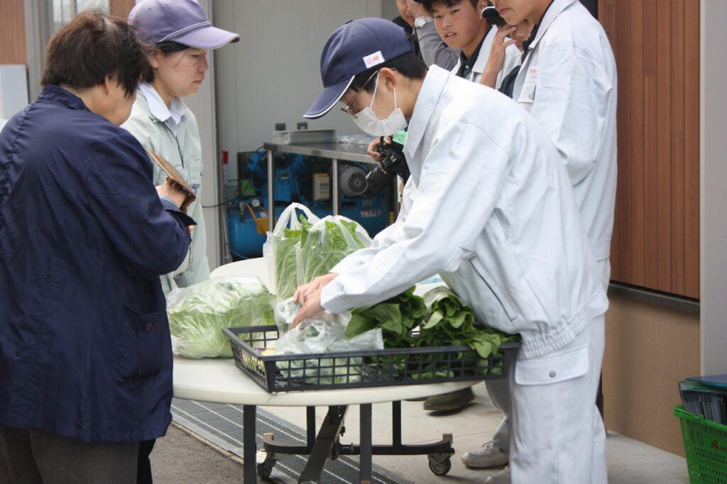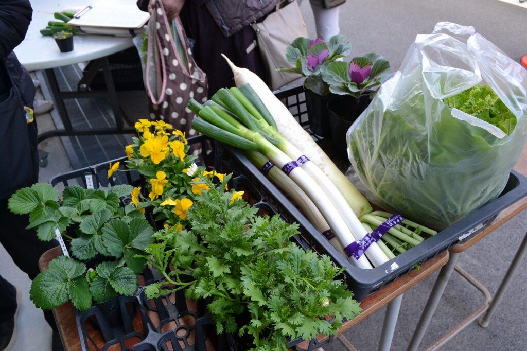 今回のアグリマーケットでは日頃の学習活動で栽培してきたハクサイや長ネギなどの野菜や、ビオラ・ハボタンなどの草花をはじめ、タマネギ苗や果樹苗、多肉植物や観葉植物を販売しました。