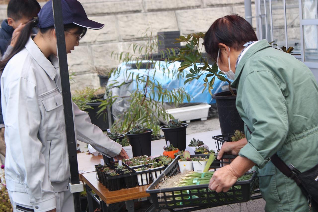 今回のアグリマーケットでは日頃の学習活動で栽培してきたハクサイや長ネギなどの野菜や、ビオラ・ハボタンなどの草花をはじめ、タマネギ苗や果樹苗、多肉植物や観葉植物を販売しました。