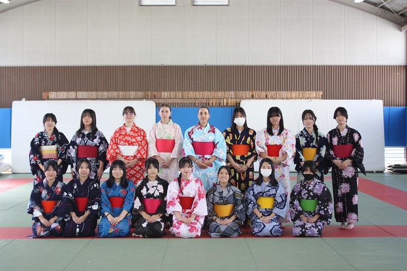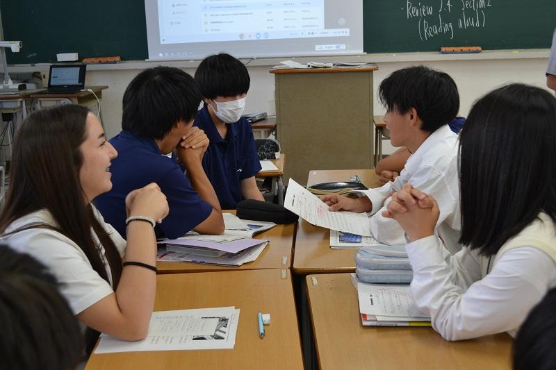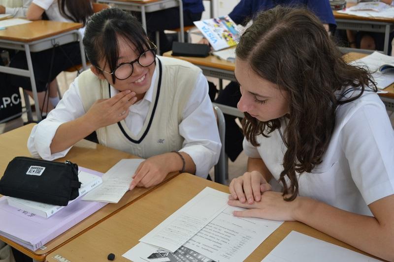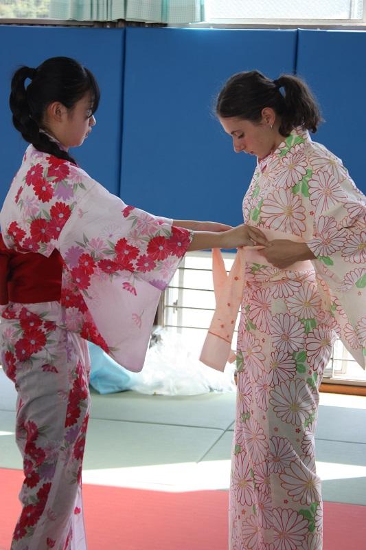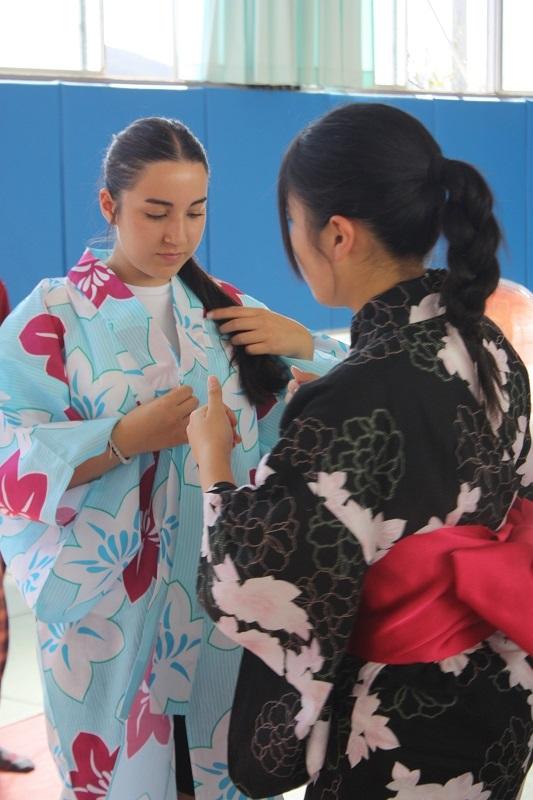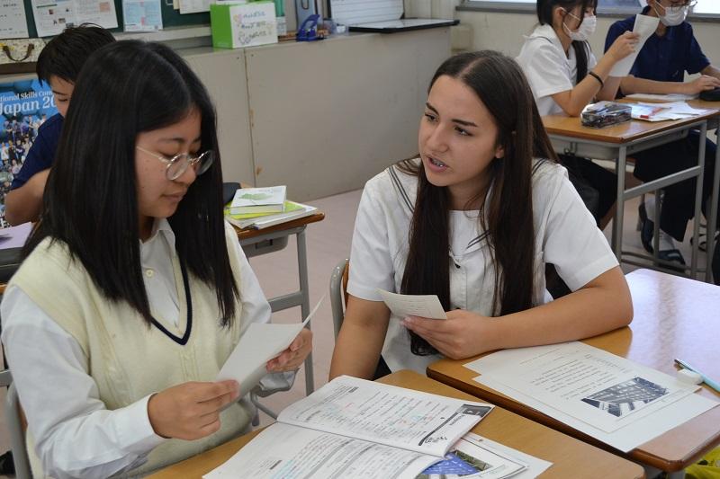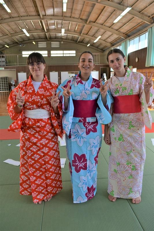 Benvenuti al liceo Maniwa! 10月9日(木)、1時間目は英語の授業でした。オーバーラッピングやシャドウイングなど様々な音読練習にペアで取り組んでいました。イタリアの留学生から発音を教わる場面もあり、楽しく英語学習に取り組むことができていました。 午後からの家庭科の授業では、浴衣の着付けに挑戦しました。来校初日に生徒会より記念品としてプレゼントされた浴衣に袖を通しました。帯の締め方で苦労する様子も見られましたが、クラスの生徒と教え合いながら上手に着ることができました。