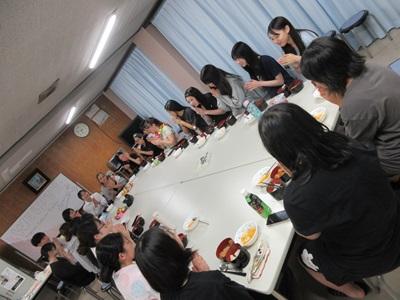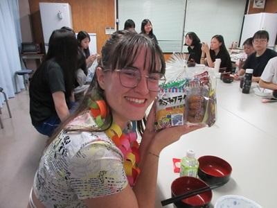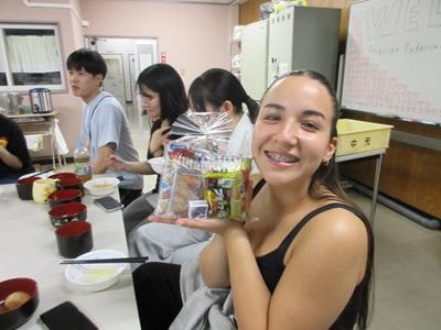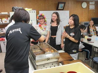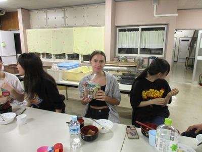 この日の夕飯のメニューは、和食のおでんとフルーツポンチでした。イタリアの留学生3人は、初めてのおでんに興味を示しながらも、慎重に食べる様子が見られました。^_^