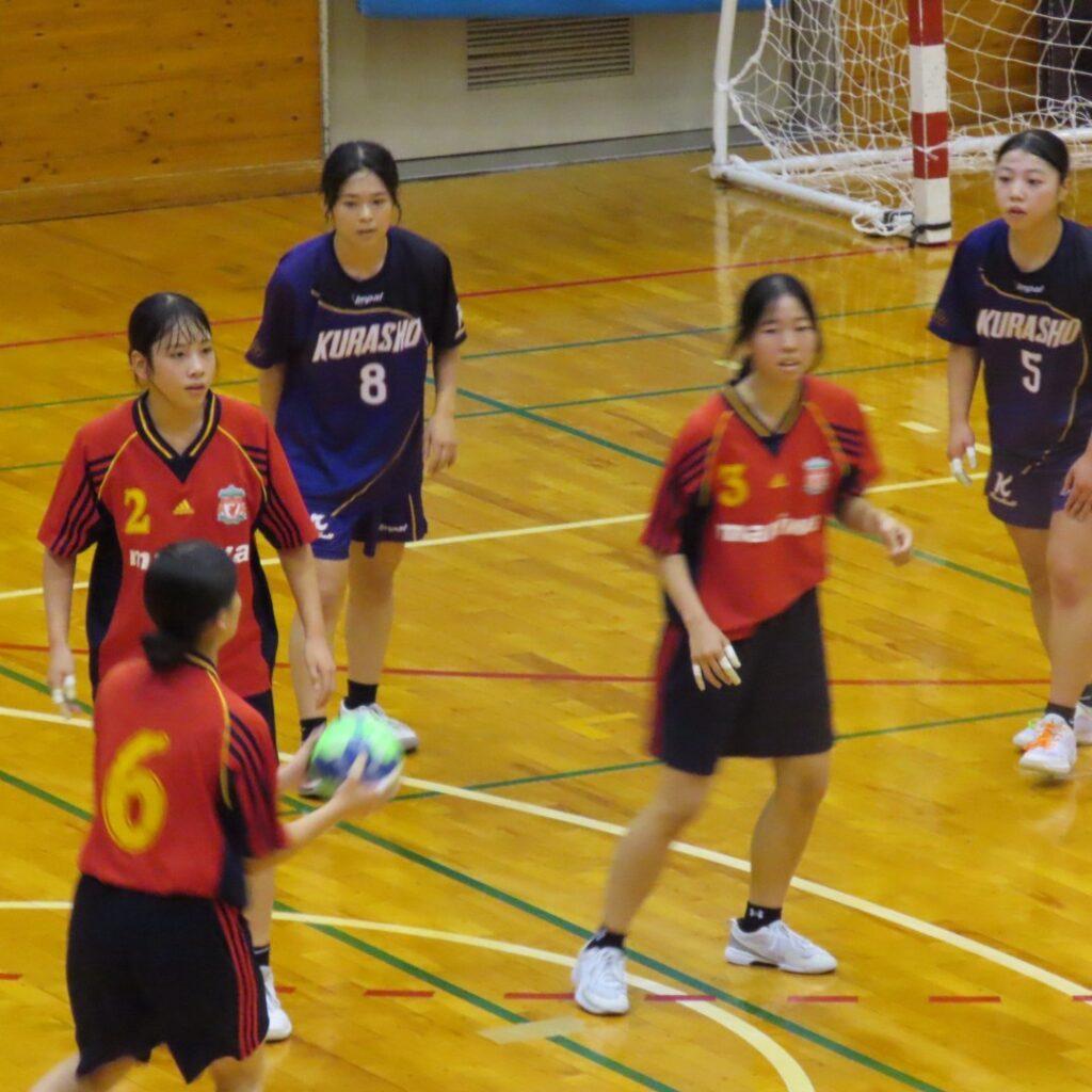 準々決勝は倉敷商業と対戦しました。相手の積極的なディフェンスから速攻に繋がれ、圧倒されてしまいました。しかし、随所に良いプレー、惜しいプレーが出て、練習してきたことを表現する選手の姿がありました。結果は8−32(前半3−17、後半5−15)で敗戦しましたが、今後に繋がる試合ができました。