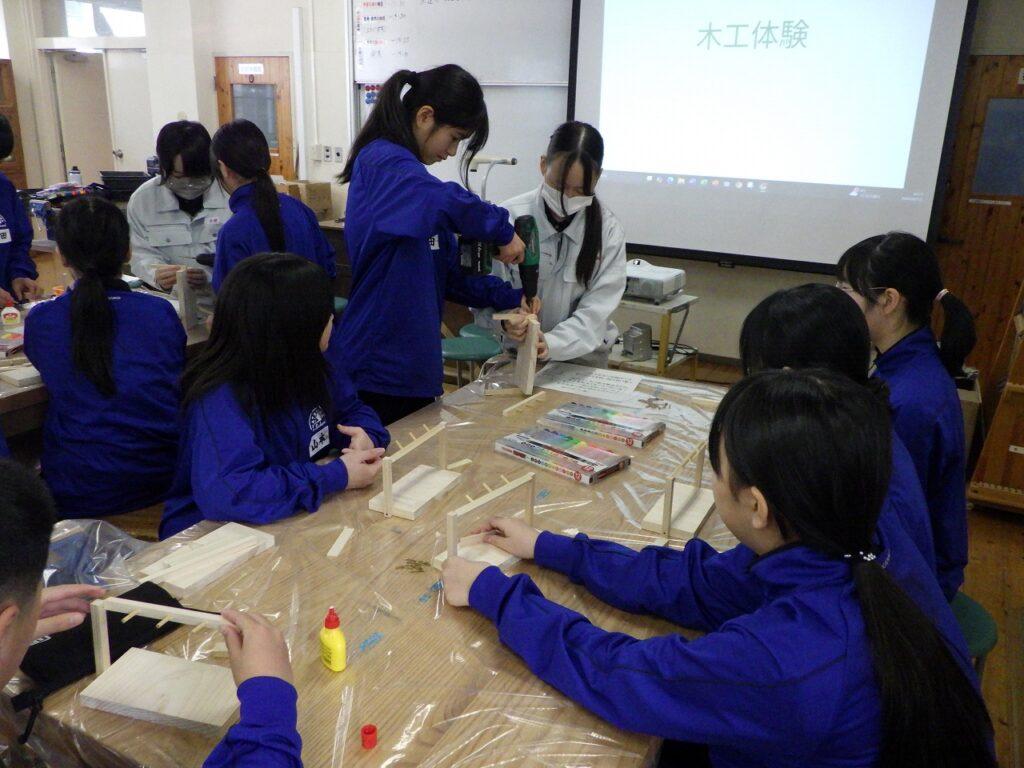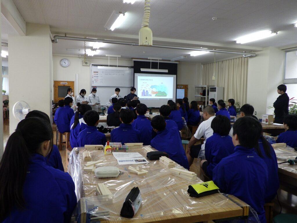 2月12日(木)に食農生産科2年が、科目「生物活用」の授業で、勝山中学校1年生に向けて、森林と木工の出前授業を行いました。