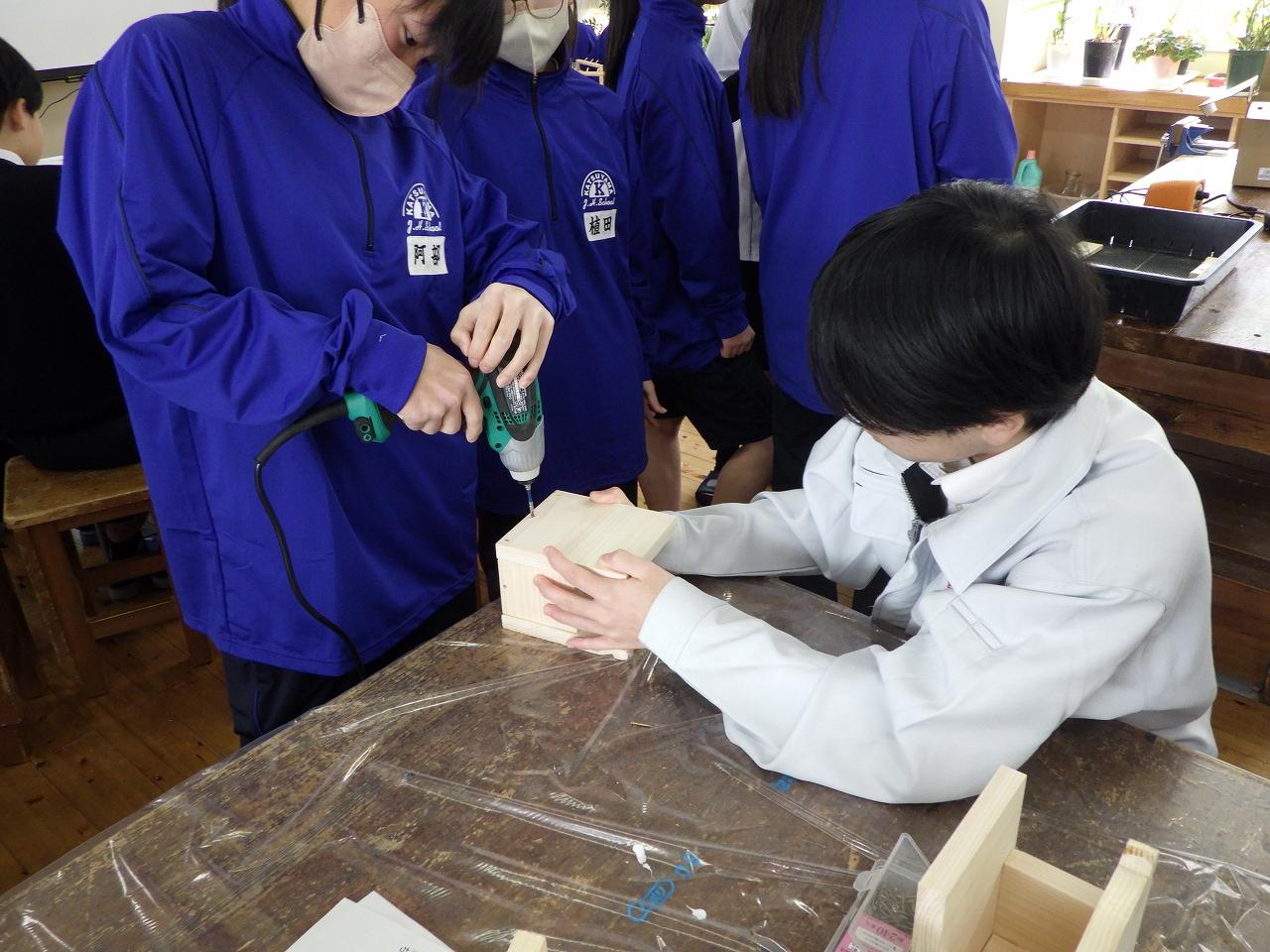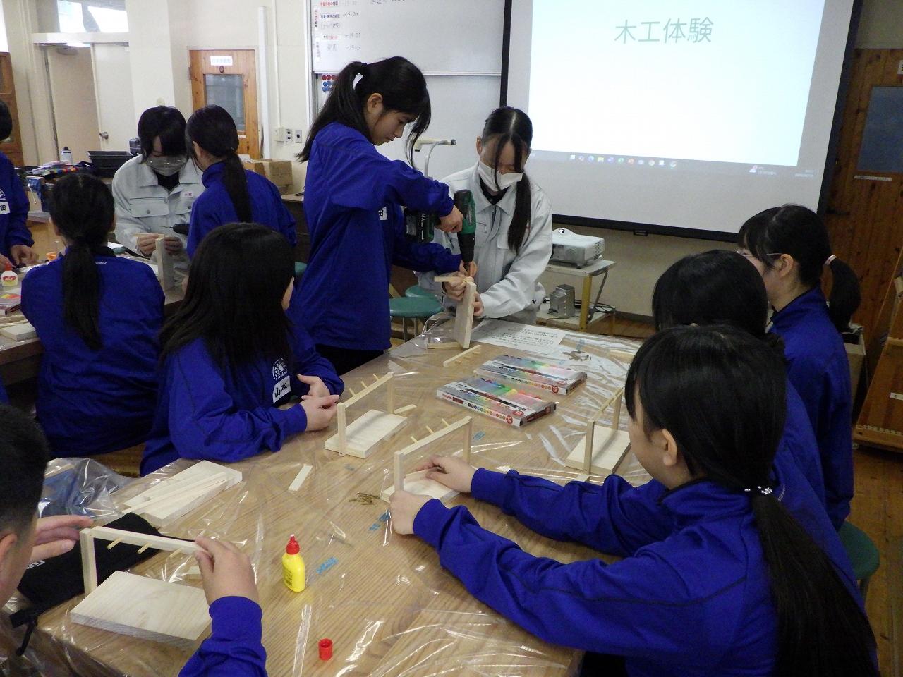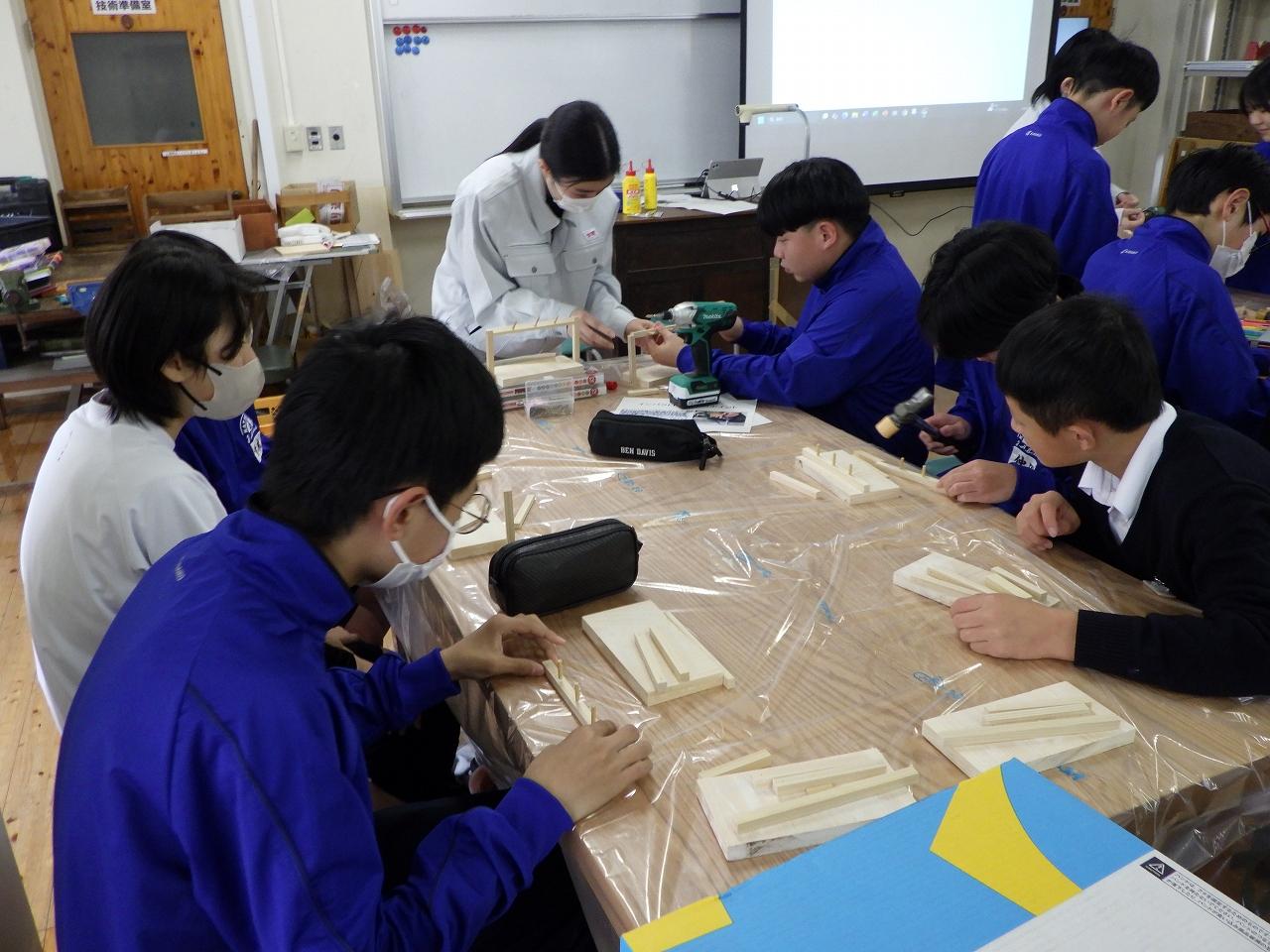 中学生の皆さんも初めて使う工具にドキドキしながら作成していましたが、本校生徒たちは楽しそうにしている中学生の姿を見て、準備から実施までの達成感を味わい、充実した出前授業になりました。