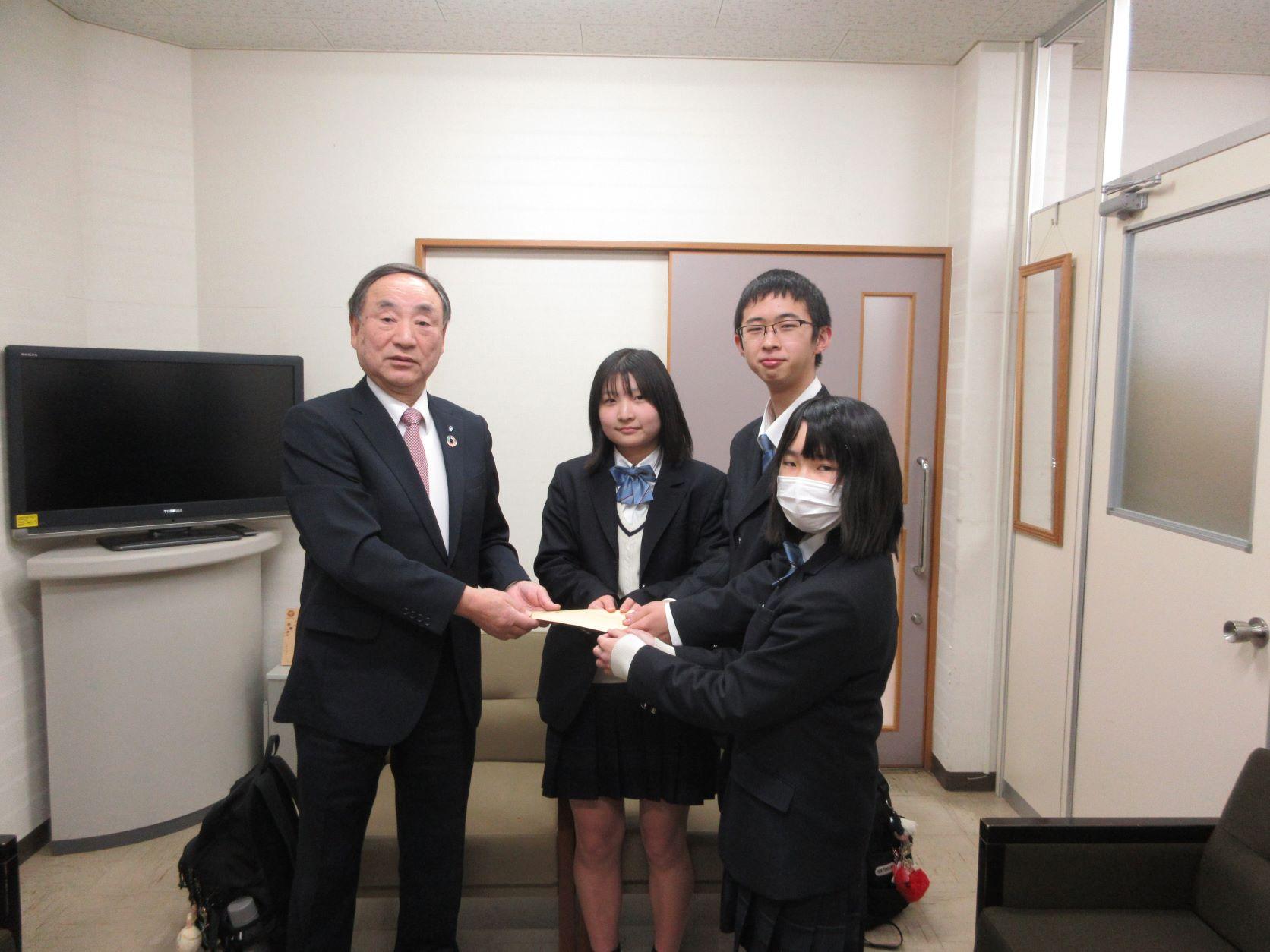 1月30日(金)、模擬店実施団体を代表して、1年2組と2年2組の生徒3名が社会福祉協議会を訪問し、三船会長に収益金90,914円を手渡しました。