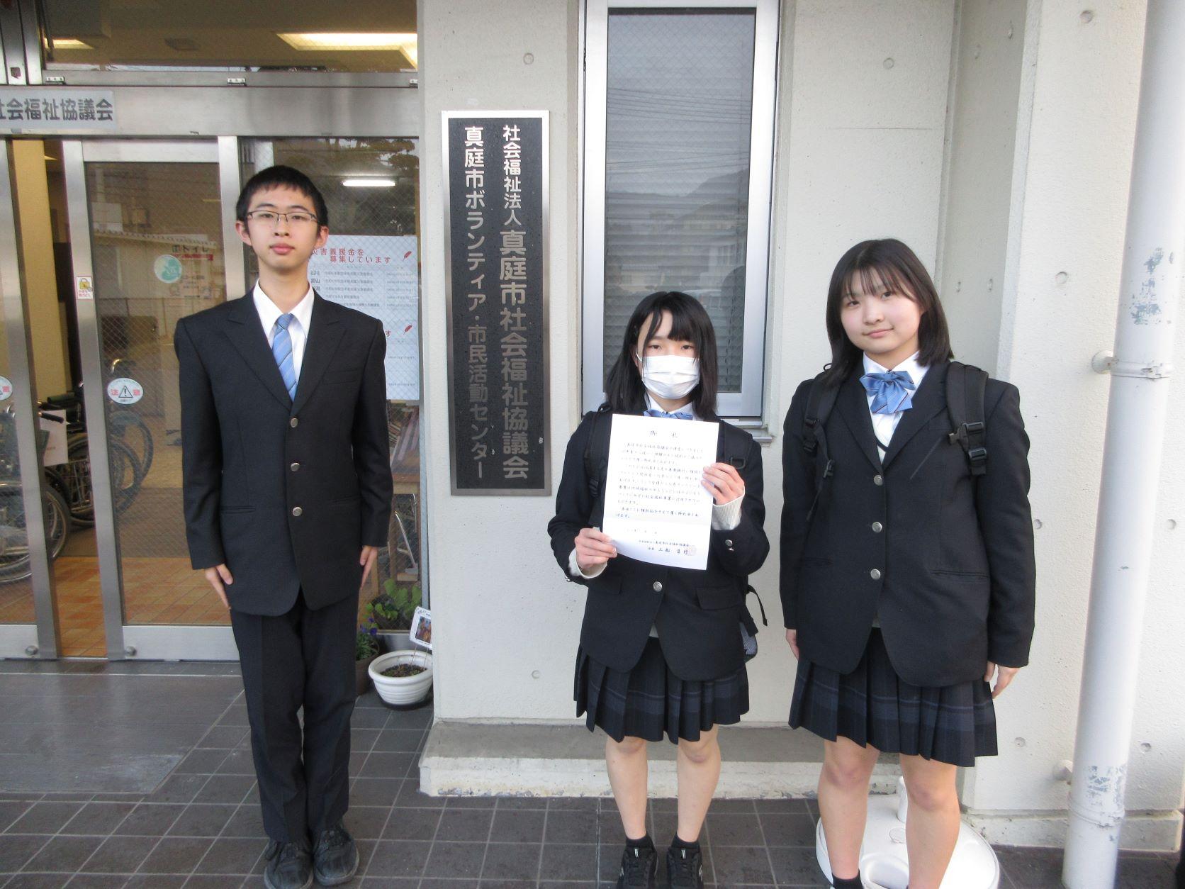 真庭高校生徒会では、今年度11月23日に開催した白梅祭文化の部模擬店の収益金を真庭市社会福祉協議会に寄付することにしました。