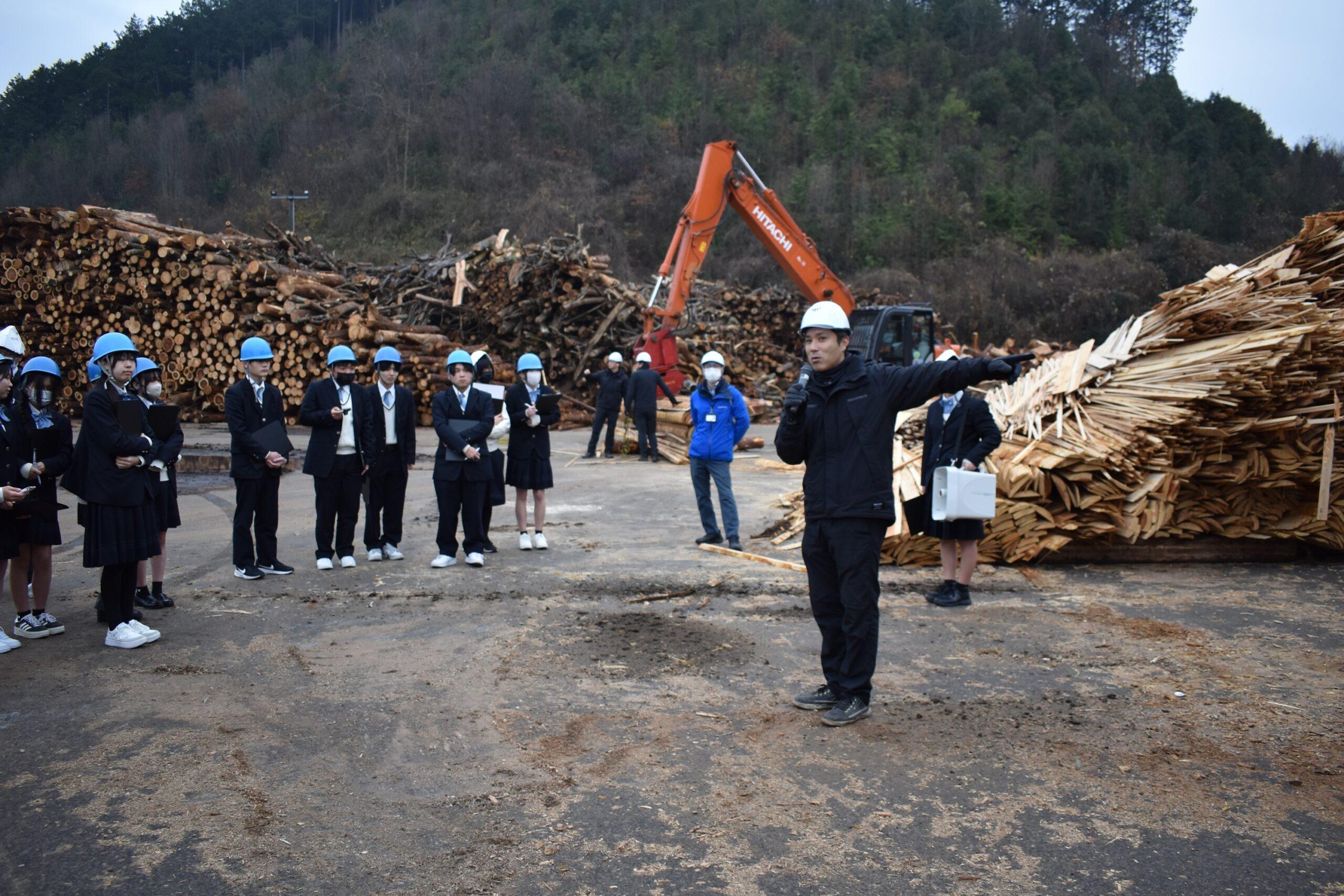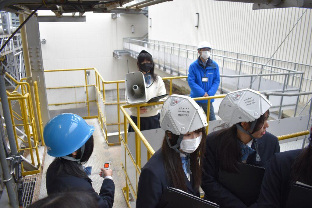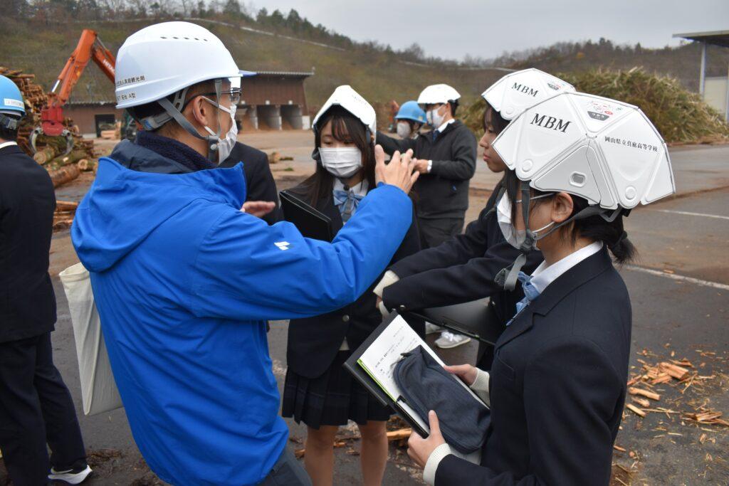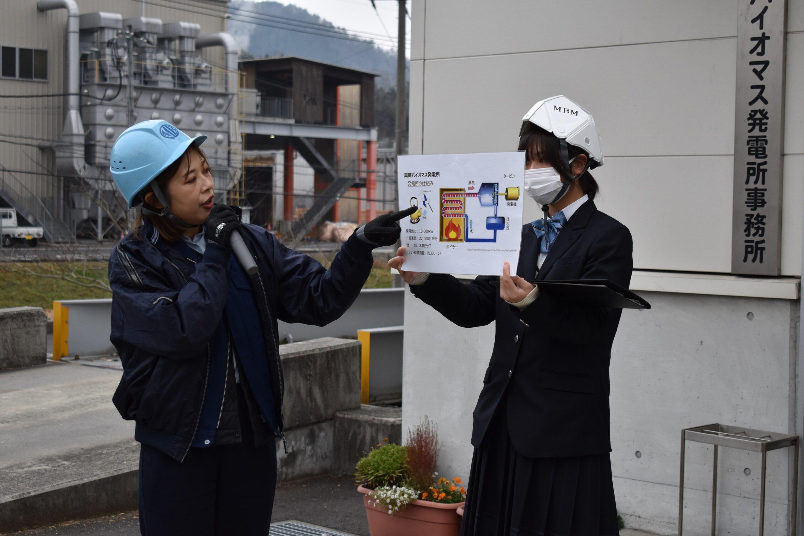 経営ビジネス科では、1年生から3年生にかけてバイオマスツアーガイド養成講座を実施しています。12月17日(水)に2年生のバイオマスツアーを実施しました。このツアーで真庭バイオマス集積基地第二工場、真庭バイオマス発電所を見学し、真庭観光局スタッフの方の動きや話す内容といったガイド技術を学びました。今回のツアーで得た学びをもとに、バイオマスツアーのガイドを実践していきます。
