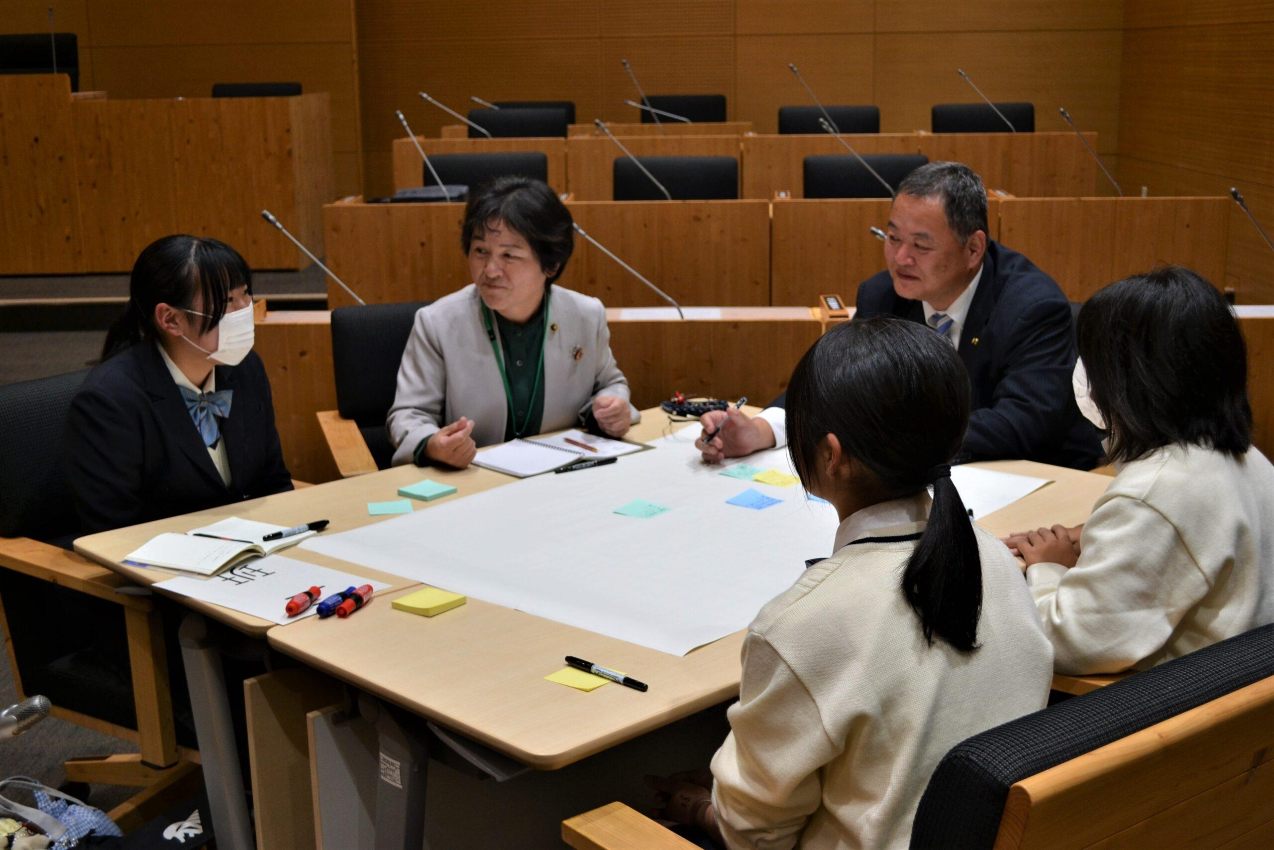 初めて入る議場の雰囲気に最初は緊張した面持ちでしたが、市議の皆さんに優しく接していただき、自分の意見をしっかりと発言することができたようです。