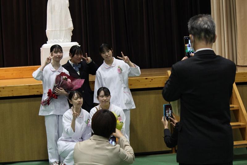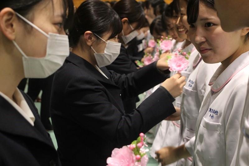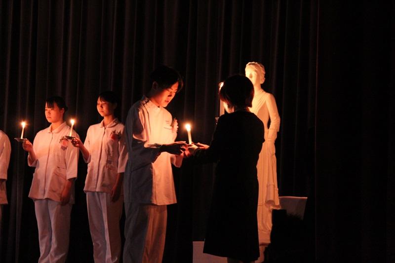 看護科2年生17名は開式前に専攻科2年生から胸にコサージュをつけてもらい、荘厳な雰囲気の中、ナイチンゲール像から継承した灯火を中川看護科長から受け取りました。
