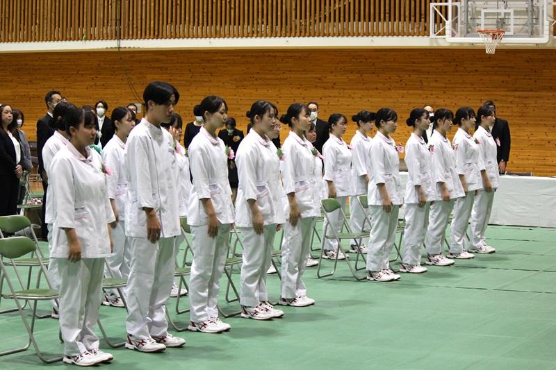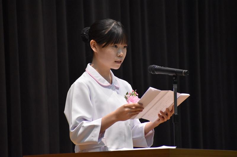 宣誓者を代表して玉岡里彩さんが、「臨地実習では今まで学んできたこととクラスの支え合う力を最大限に生かして精一杯頑張ります」と臨地実習に向けての決意を表明し、最後に看護科生徒全員でナイチンゲール讃歌を美しいハーモニーで合唱しました。
