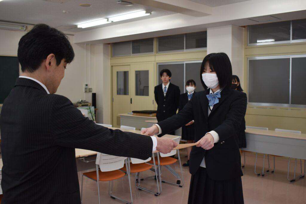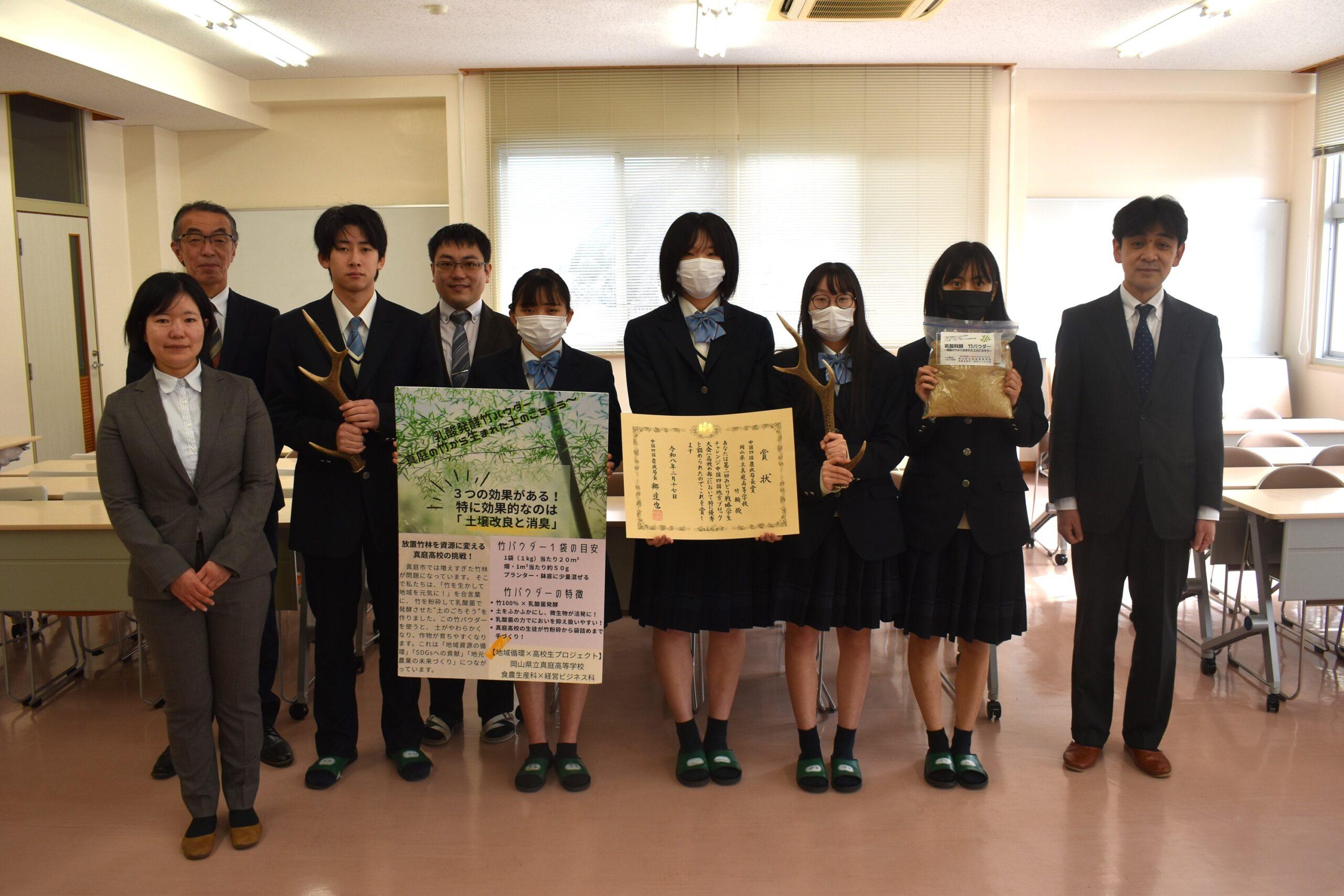第2回みどり戦略学生チャレンジ中国四国ブロックで食農生産科・経営ビジネス科の課題研究合同チーム「竹輪」が中国四国農政局長賞を受賞しました。中国四国ブロック53チームの中で最優秀賞となり、2月24日に農政局より来校され授与式が執り行われました。