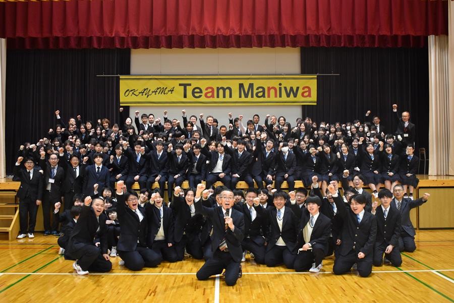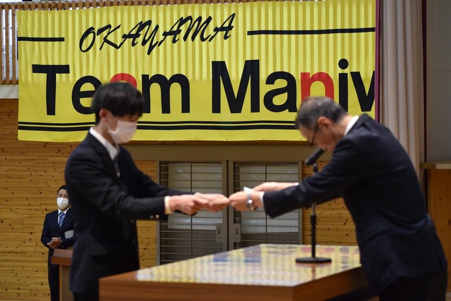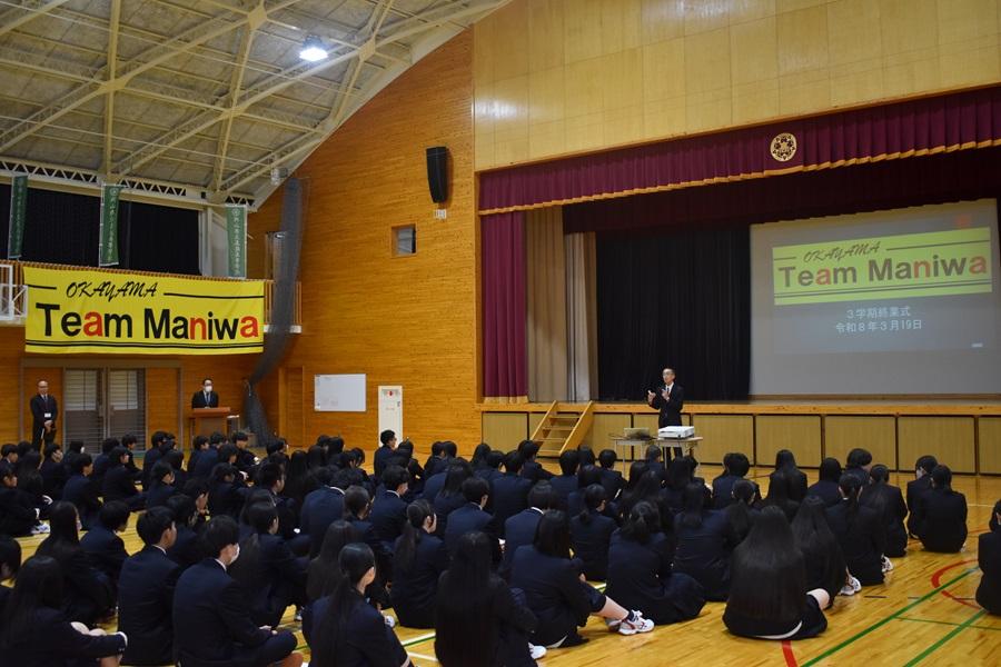 3月19日、本校体育館にて表彰伝達式および3学期終業式を行いました。 表彰伝達式では、「令和7年度 美作地区高等学校美術部展」で優秀賞を受賞した生徒が表彰されました。続く終業式では、新調した横断幕がお披露目され、生徒たちからは大きな歓声が上がりました。 今年度も「チーム真庭」をスローガンに、社会で通用する資質・能力の育成に励んでまいりました。保護者や地域の皆様、多大なるご支援・ご協力をいただき、誠にありがとうございました。 来年度も、この横断幕に恥じない「チーム力」を磨き、より一層地域社会に貢献できる真庭高校を目指してまいります。