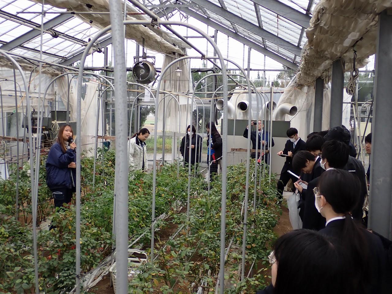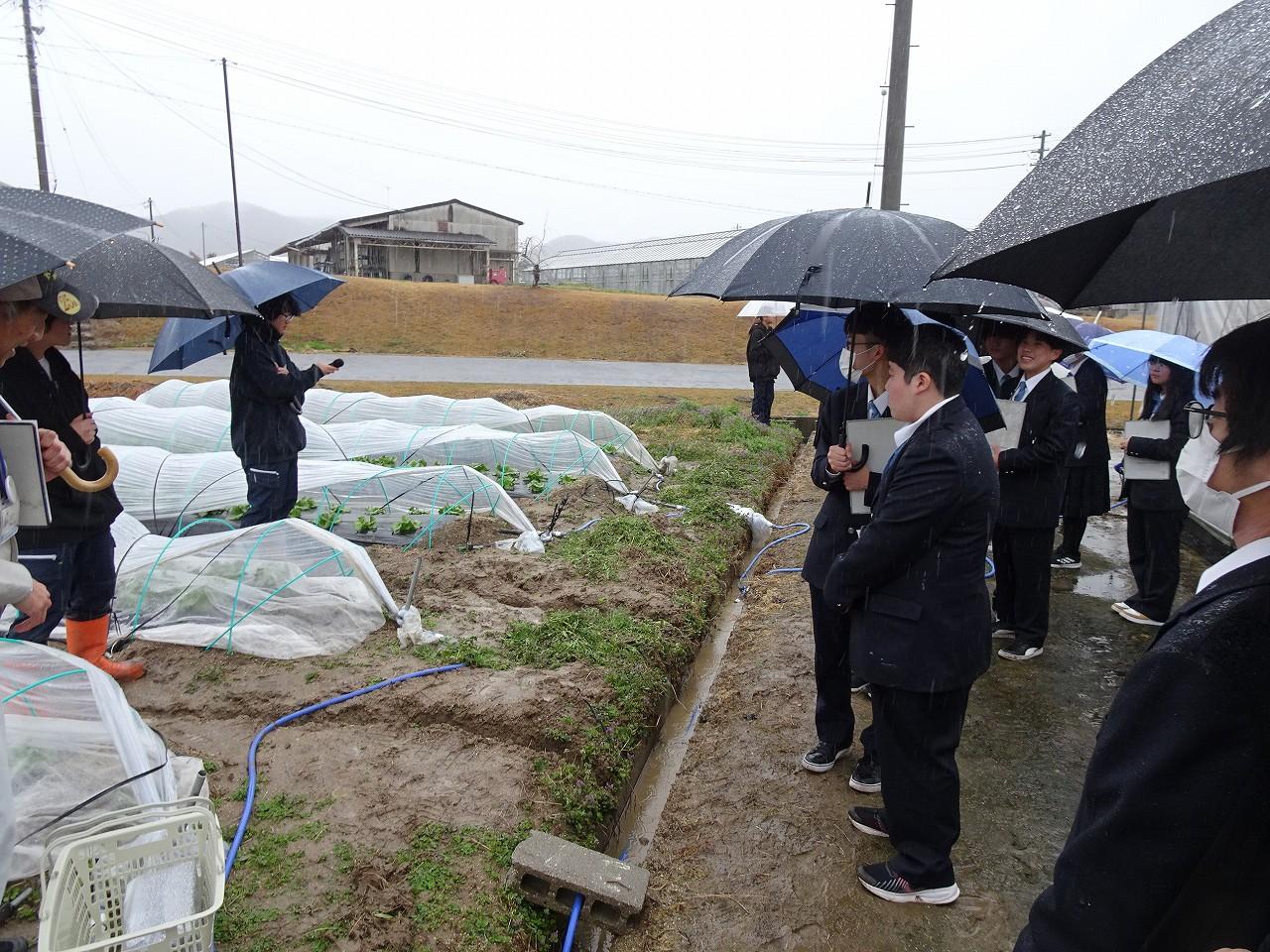 あいにくの雨天でしたが、大学校では野菜・花き・果樹コースの実習ほ場を見学し、日頃の授業ではなかなか見ることのできない広いほ場や多くの作物に触れることができました。