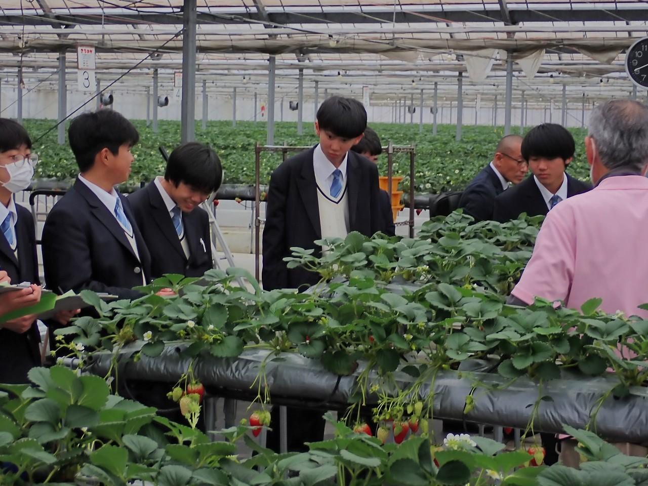 県内最大級の連棟イチゴハウスでは、広いハウスいっぱいに広がるイチゴの様子に生徒たちも驚きの声を上げていました。