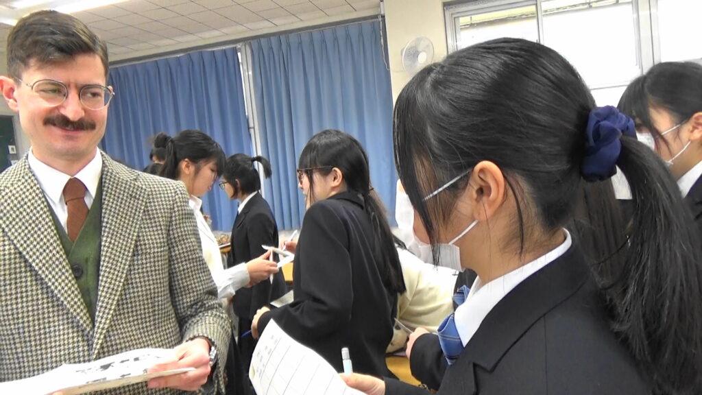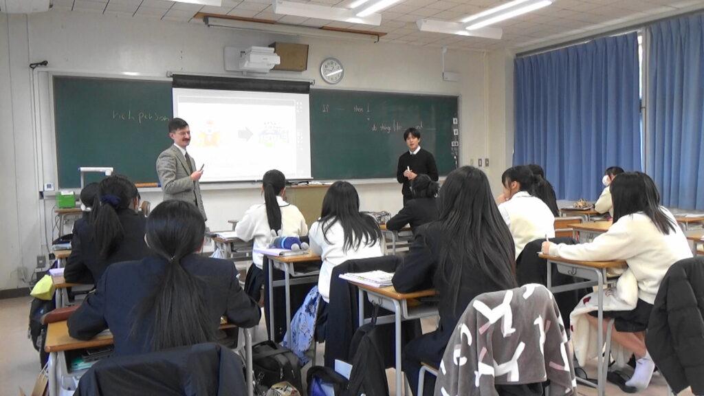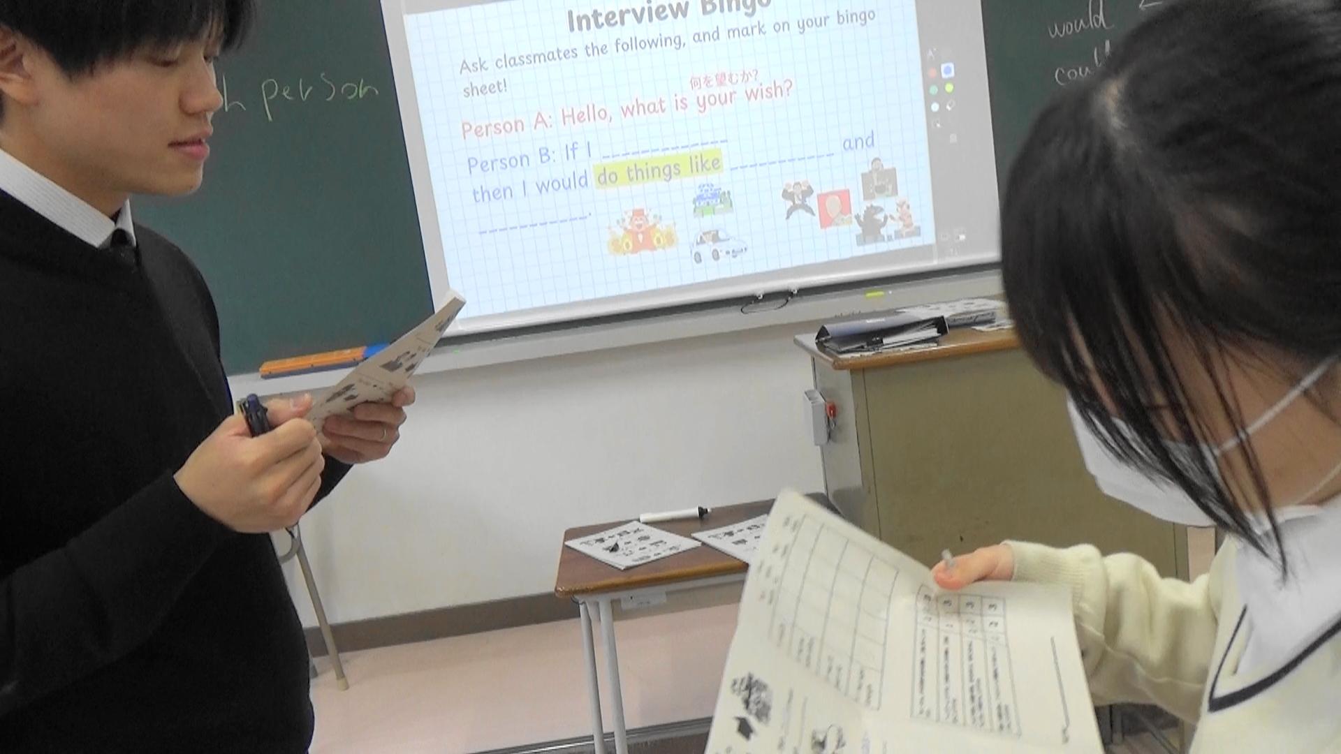 英語科の渡邉先生とALTのコーリ・カンタルッピ先生が看護科1年生の英語コミュニケーションⅠの授業をティームティーチングで実施しました。今日の授業のテーマは「仮定法」です。授業はビンゴゲームを使いながら「もし〇〇だったら」という表現に楽しく慣れていきました。最後は自分のアイデアをワークシートにまとめて完了。仮定法の基本が身についたようです。