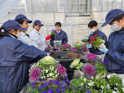 12月7日(木) 食農生産科2年生でハボタン、ビオラなど春先まで楽しめる草花の寄せ植えをつくり、JR美作落合駅に設置させていただきました。 これまでに学んだことをもとに寄せ植えを作ったので、色などは生徒の個性が出たものになりました。その後、JR美作落合駅に設置させていただきました。落合駅を通られる際はぜひご覧ください。 なお、この様子は真庭いきいきテレビ(MIT)の番組内で放送されます。放送日は後日、お知らせします。 ,